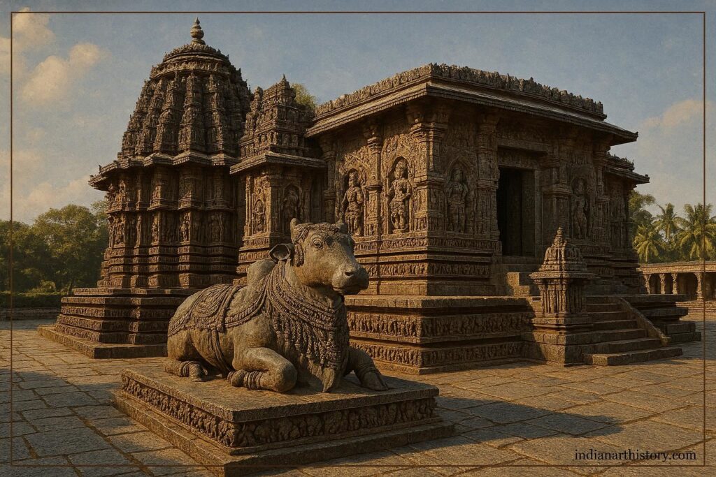 📖 व्याख्या: होयसल मंदिर उत्तर (नागर) और दक्षिण (द्रविड़) दोनों शैलियों के मिश्रण — बेसर या वेसर शैली — में निर्मित हैं।