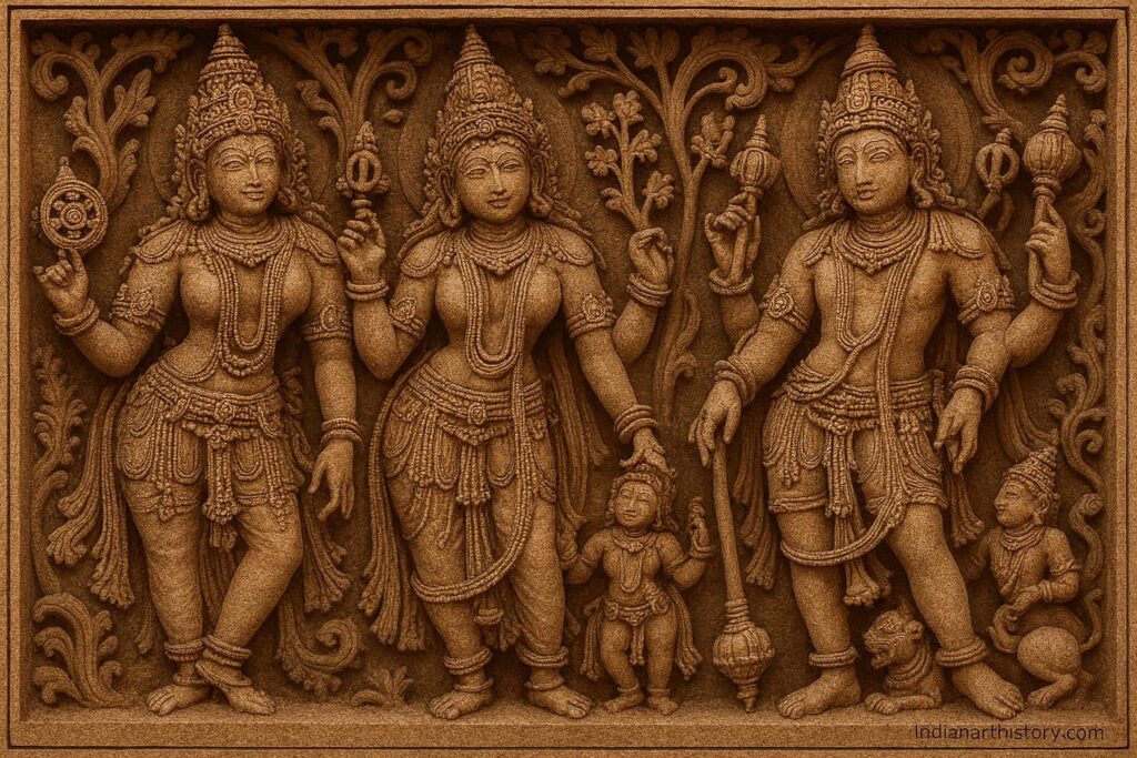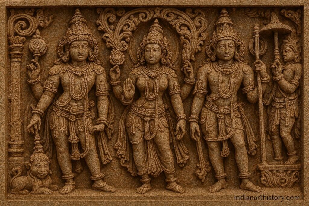 📖 व्याख्या: सप्तमातृका सात माँ देवियाँ हैं — ब्राह्मी, माहेश्वरी, कौमारी, वैष्णवी, वाराही, इंद्राणी और चामुंडी — जो होयसल मंदिरों में एक साथ उकेरी जाती हैं।